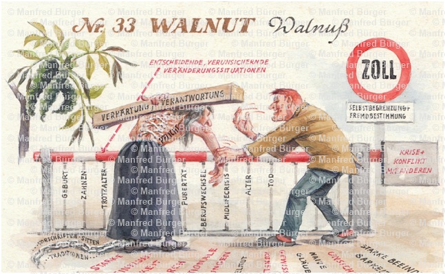 ![]() In der Akupunktur gibt es den Punkt Dünndarm 3. Die Übersetzung seines Chinesischen Namens heißt: „von hier nimmt der Neuanfang seinen Ausgang“. Dieser Punkt hilft genau wie die Bachblüte „Walnut“ Begrenzungen zu überwinden. Oft fehlt nur ein kleiner Schritt um seine Lebensziele oder Wünsche zu erreichen - „aber“ in dieser so wichtigen Wandlungsphase des Neuanfangs, ist man besonders beeinflussbar und braucht Unterstützung, um die Grenze auch wirklich zu überschreiten. Denn an den Grenzen lauern Zollbeamte, wie z.B. alte Gewohnheiten, Ängste, Vorschriften, wirkliche oder vermeintliche Experten. Diese Zollbeamten wissen immer alles besser und versuchen uns als Autoritäten zu beeinflussen, von unserem Weg abzubringen, und damit werden wir unseren eigenen Zielen untreu. Körperlich fordern uns Symptome, die mit dem Rhythmus und jeglichen Zyklen unseres Körpers zu tun haben. Diese Symptome können sein: Störungen der Atmung, des Dickdarms, Mond- und Wetterfühligkeit, Blasenprobleme, Infektionen, Schwindel, Süchte oder Depressionen – Quasi die Aufforderung unseres Schicksals zur Rückbesinnung auf die Selbstverwirklichung der eigenen Ziele. Gewohnheiten geben Sicherheit, da man durch sie genau weiß, was als nächstes kommt. Das führt aber dazu, dass diese Verhaltensmuster einengen und jeden Fortschritt verhindern. In einer solchen Situation lohnt es sich die alten Verhaltens-, Denk- und Handelsweisen zu hinterfragen. Dafür ist folgende Frage von besonderer Bedeutung: „Ist der Nutzen und die Sicherheit der alten Gewohnheit wirklich so groß,